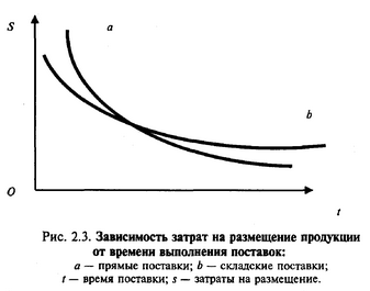Транзитная форма поставок характеризуется более тесной связью затрат с возможным временем поставок, причем до определенного момента более эффективной оказывается складская форма, а при несрочных или ритмичных поставках – транзитная форма.