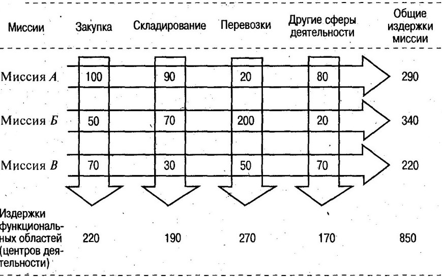 Из рисунка видно, как сформулированные миссии сферы распределения могут оказывать различное влияние на издержки функциональных областей и при этом обеспечивают вполне логичную основу для калькуляции издержек фирмы. Иными словами, в настоящее время на конкурентных рынках функциональные логистические расходы определяются потребностями выполняемой миссии, то есть суммированием затрат по вертикали.