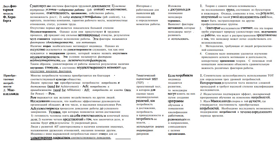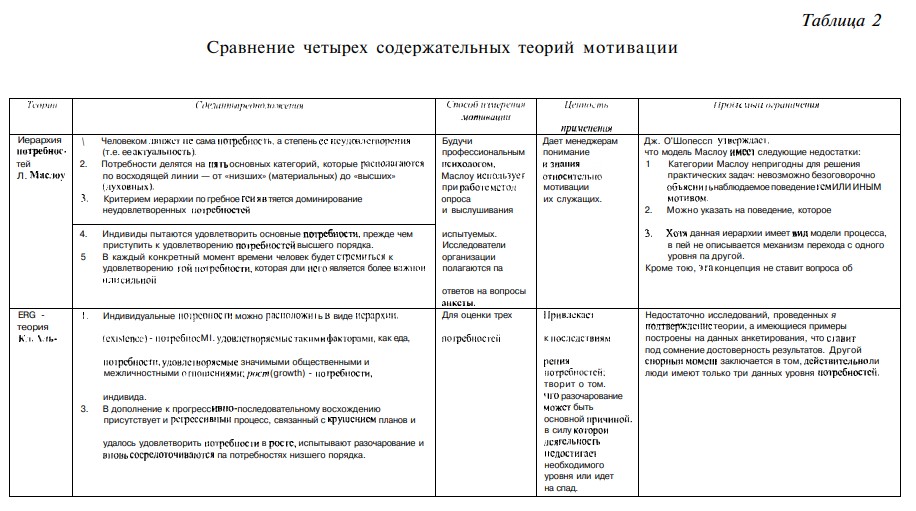 Каждая из четырех содержательных теорий объясняет человеческие потребности и поведение с очень небольшими различиями. Ни одна из них не используется менеджерами в качестве единственной теории, объясняющей феномен мотивации. Основное различие между четырьмя теориями заключается в том, что Д. Макклелланд выделяет потребности, приобретаемые под влиянием жизни в обществе; А. Маслоу предлагает иерархическую систему потребностей; Кл. Альдерфер — гибкую трехуровневую классификацию, а Ф. Херцберг обсуждает внутренние и внешние факторы работы.