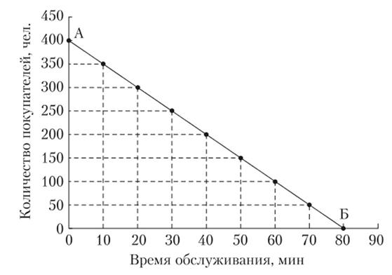 В точке Б, лежащей на пересечении прямой с осью абсцисс, численность покупателей полностью определяется временем обслуживания, а влияние всех остальных факторов равно нулю.