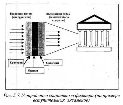 Рассмотрим устройство социального фильтра на примере вступительных экзаменов в вуз. Первое свойство фильтра — количество входящих в него всегда больше количества выходящих. Если конкурс в данный вуз 3 человека на место, то разность двух потоков равняется этой величине, иначе говоря, входящий поток в 3 раза превышает выходящий.