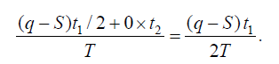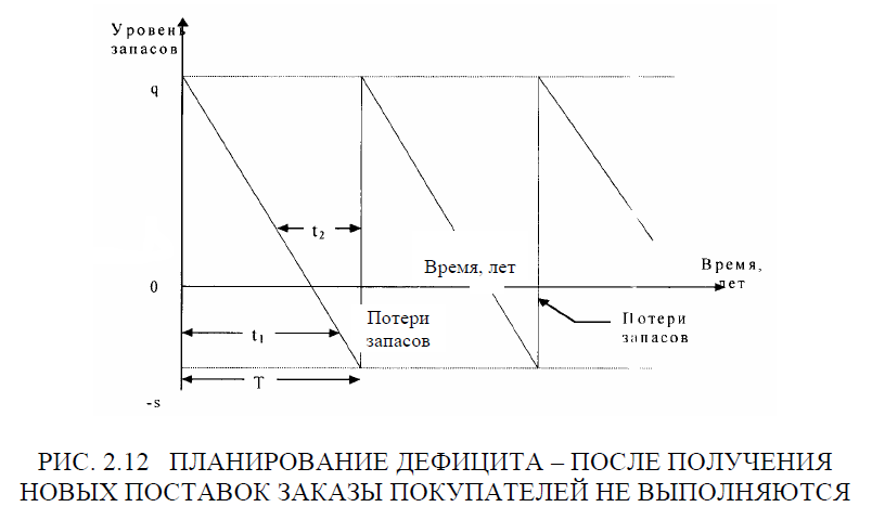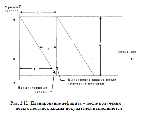 Для того, чтобы рассчитать средний уровень дефицита, можно использовать описанный выше алгоритм. В течение периода t2 средний размер дефицита составит S /2 единиц продукции, а в период t1 его значение будет равно нулю. Поэтому среднее число недостающих единиц продукции в течение всего цикла определяется как