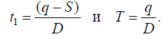 В период существования запаса t1 средний уровень запаса равен (q – S) / 2. Следовательно, на складах хранится (q – S) / 2 единиц продукции в среднем в течение периода t1. В итоге получаем (q – S) t1 / 2 единиц продукции. Для оставшейся части цикла, то есть для времени t2 на складах хранится 0 единиц продукции; в итоге получаем 0 ´ t2 единиц продукции. Требуется найти среднее число единиц продукции, которое хранится в запасе в течение всего цикла Т.
