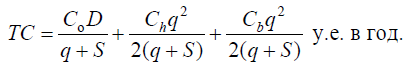 Если рассматривать первый случай, в котором заказы клиентов не выполняются, то процедура анализа будет аналогична приведенному выше алгоритму, за исключением того, что максимальный размер запасов окажется равным q. Поэтому можно просто произвести замену (q – S) на q, a q – на (q + S), подставив указанные значения в формулы расчета среднего уровня запасов и среднего размера дефицита. В этом случае уравнение общей переменной стоимости примет вид:
