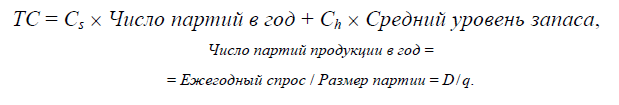 Каково оптимальное значение размера партии продукции q для первого станка? С какой частотой следует выпускать партии продукции? Общая переменная стоимость партии продукции за год ТС включает в себя стоимость производственного цикла и издержки хранения. Следовательно,