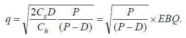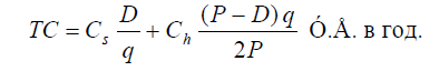 Размер партии деталей равен q, однако, поскольку детали используются по мере их изготовления, максимальный уровень запасов q¢ меньше, чем q. Если выпуск деталей осуществляется с ежегодной производительностью Р, потребление – с ежегодным темпом D (Р ³ D), то темп пополнения запасов равен (Р – D). Как и в модели EOQ, средний уровень запаса составляет половину его максимального уровня.