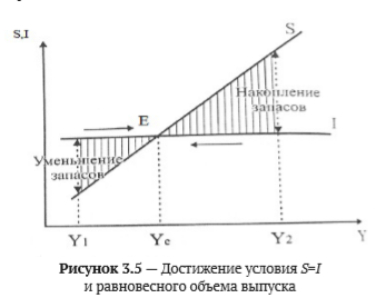Из рис. 3.5 видно, что инвестиции, способствуя увеличению объема выпуска Y, толкают национальную экономику в точку равновесия е (Ye > Y1), где достигается равенство инвестиций и сбережений.