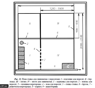 Площадь станка для содержания свиноматки (рис. 21) должна быть около 5 м2, а для молодняка на откорме – 3–4 м2.