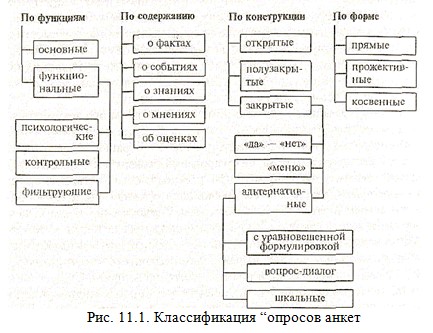 Успех проведения анкетирования, достоверность получаемой информации во многом зависят от правильности формулировки и последовательности вопросов. Вопросы анкеты различаются в зависимости от их функций, содержания, конструкции, формы (рис. 11.1).