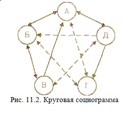 Обработка данных социоматрицы ведется двумя основными способами. Первый — графический, путем построения социограммы, наглядно отражающей взаимосвязи в группе. Члены группы изображаются условными обозначениями, а выборы — сплошными (предпочтение) или пунктирными (отклонение) стрелками, направленными от того, кто выбирает, к тому, кого выбирают. Стрелка с двумя концами означает взаимный выбор или отклонение. Социограмма позволяет наглядно определить позицию каждого члена коллектива, установить “звезд”, получивших наибольшее число предпочтений, “пренебрегаемых”, получивших малое их число, “отвергаемых”, получивших много отклонений, “изолированных”, не получивших ни предпочтений, ни отклонений. По способу построения различают круговые (все члены коллектива на графике располагаются по кругу), концентрические социограммы (получившие большее число предпочтений располагаются ближе к центру круга, образуя своего рода “ядро”), “звезду” (в центре — член группы с наибольшим количеством отданных ему предпочтений, остальные располагаются вокруг) и др. Применяются так называемые “локограммы”, когда обозначения взаимных выборов и отклонений наносятся на схему реального расположения рабочих мест. Ниже приведена социо-грамма (круговая) по данным нашей социоматрицы.