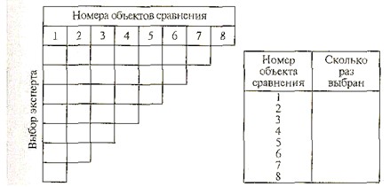 Сначала первый объект поочередно сравнивается со всеми последующими — номер выбранного из каждой пары объекта заносится в колонку под номером 1. Затем со всеми последующими сравнивается объект — номер выбранного из каждой пары заносится в колонку под номером 2 и так далее. По окончании сравнений в приведенную выше таблицу заносится, сколько раз эксперт отдал свое предпочтение каждому из сравниваемых объектов во всех сравнениях.