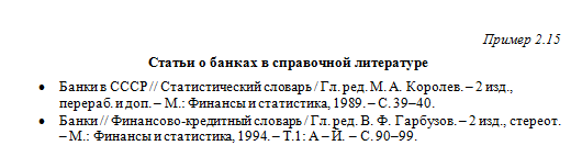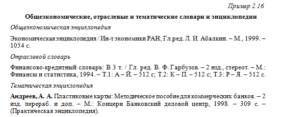 В библиографическом списке приводятся сведения о статье, взятой из энциклопедии с описанием самого источника. Поэтому к данному виду источника применяются правила описания составной части документа. В примере 2.15 дается образец библиографического описания статей из справочной литературы.