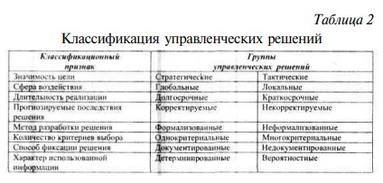 В процессе управления организациями принимается огромное количество самых разнообразных решений, обладающих различными характеристиками. Тем не менее существуют некоторые общие признаки, позволяющие классифицировать это множество определенным образом. Такая классификация представлена в таблице 2: