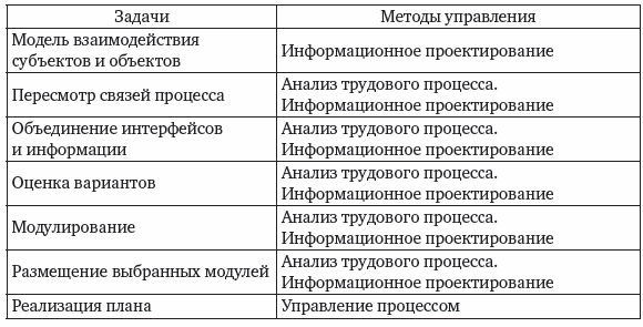 Нередко при выполнении задач данного этапа рассматривается та часть процесса реорганизации, которая может осуществляться автономно. Поэтому возможно перегруппировывать процессы, используя различные технологии для моделирования, сбора информации, компьютерных разработок, создания экспертных систем, баз данных и др. (табл. 5).