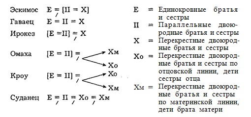 Можно заметить, что теоретически можно вывести еще одну, последнюю, терминологическую систему, которая не делала бы различий между единокровными и перекрестными двоюродными братьями и сестрами, но отличала бы их от параллельных двоюродных братьев и сестер (т. е. Е = X ^ П).