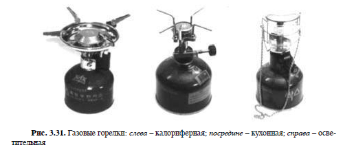 Нагревательные приборы в зависимости от вида используемого топлива подразделяют на примусы, газовые горелки и спиртовые плитки. Примус туристский предназначен для приготовления пищи и кипячения воды. Топливом для него служит чистый (неэтилированный) автомобильный бензин. Газовые горелки (рис. 3.31) обеспечивают наибольший комфорт при приготовлении пищи и обогреве помещения, так как наименее токсичны в работе. Топливом для газовых плиток служит сжиженный газ.