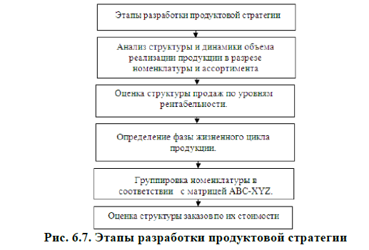 Основная продажа привязывалась к широкому спектру дополнительных ценностей, за что клиенты готовы платить дополнительные деньги (сервисное обеспечение, прокат автомобилей и т.д.). В процессе разработки продуктовой стратегии (рис. 6.7) реализуется важнейший внутренний фактор формирования доходов и прибыли – номенклатура выпускаемой продукции.