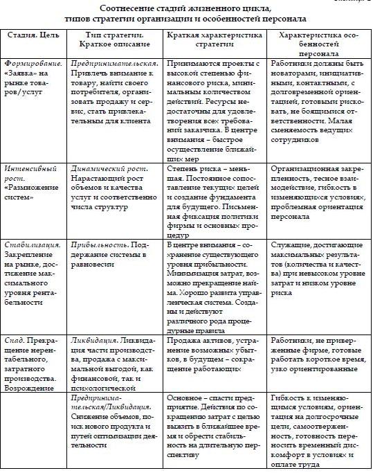 Как правило, специалисты, несмотря на продолжающиеся дискуссии, сходятся в том, что полный жизненный цикл организации обязательно включает такие стадии, как формирование организации, ее интенсивный рост или «размножение», стабилизацию и кризис (спад).